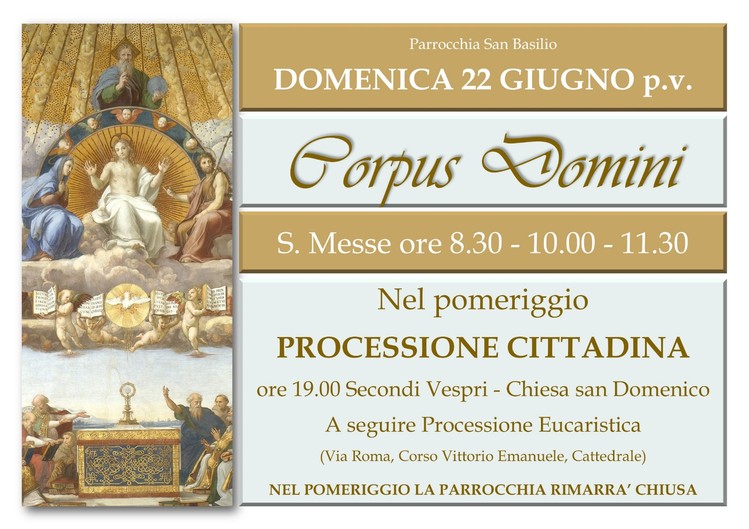 In occasione del Corpus Domini, le Sante Messe festive saranno le seguenti: